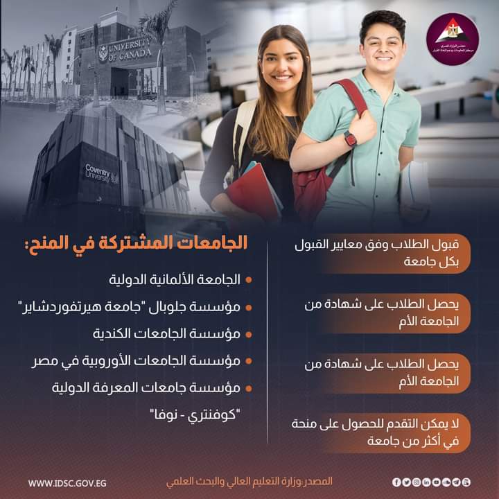 وتشمل المنح الدراسية أفرع الجامعات الأجنبية في العاصمة الإدارية الجديدة بالتعاون بين وزارة التعليم العالي والبحث العلمي وشركة العاصمة الإدارية و5 من الجامعات الأجنبية في مصر.