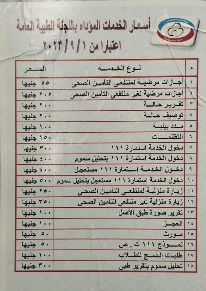 وشملت أسعار نموذج ١١١ ت.ص ب ٥٠ جنيها بدلا من ١٥ جنيها بينما تضمنت أسعار خدمة الحصول على إجازة مرضية من التأمين الصحي إلى ٥٥ جنيها.