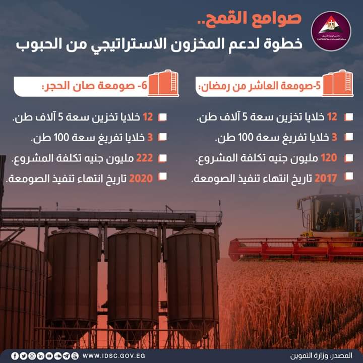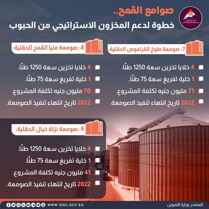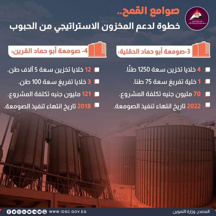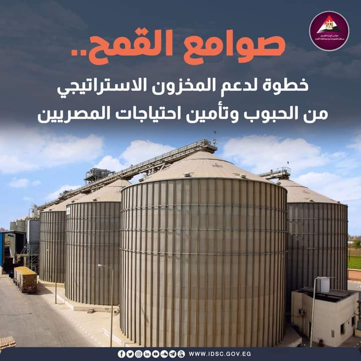 نشرت الصفحة الرسمية لمركز المعلومات ودعم اتخاذ القرار بمجلس الوزراء، عبر موقع التواصل الاجتماعي فيسبوك، إنفوجراف جديدا تحت عنوان (صوامع القمح، خطوة لدعم المخزون الاستراتيجي من الحبوب وتأمين احتياجات المصريين).