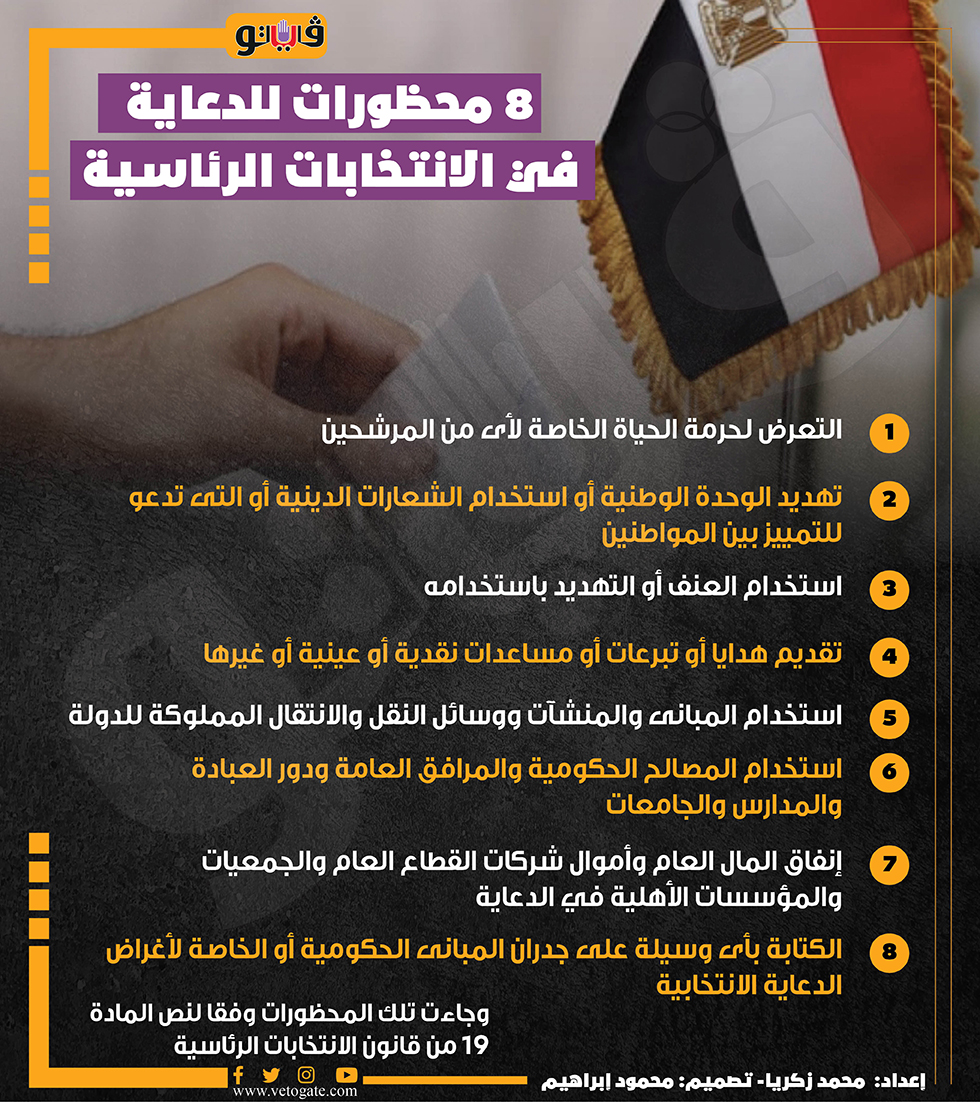 8 محظورات للدعاية في الانتخابات الرئاسية (إنفوجراف) الخميس 07/سبتمبر/2023 - 12:22 م 9/7/2023 12:22:51 PM انتخابات، فيتو محمد زكريا شارك طباعة 18 حجم الخط شارك طباعة الانتخابات الرئاسية الجمعيات والمؤسسات الأهلية المؤسسات الاهلية المدارس والجامعات المبانى الحكومية حرمة الحياة الخاصة شركات القطاع العام قانون الانتخابات