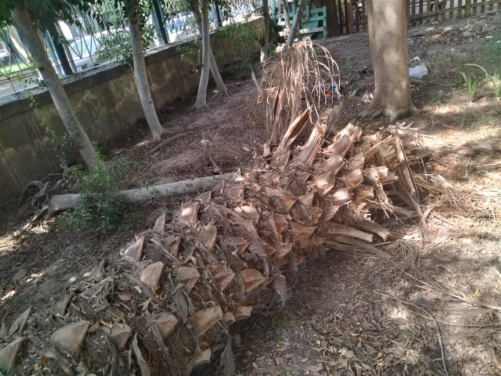 عملية التهذيب كما سُميت لم تطل الأشجار المعمرة فقط بل طالت حتي النخيل المطل من علي جانبي الحديقة والذي يرجح نسبة إلي نوعية "ايكانيوس" من مدغشقر والذي يُقال أنة يعيش أكثر من مائتي عام.