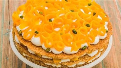 * ادهني صينية الفرن بقليل من الزيت، ثم ضعي العجينة بالصينية، وزينيها بالفستق وادخليها الفرن.