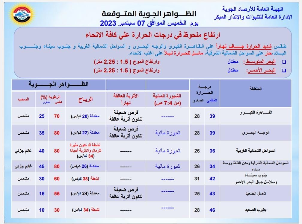 كما أشارت إلى نشاط الرياح على مناطق من جنوب سيناء وجنوب الصعيد بسرعة «34 كم/س تقريبًا»، قد تكون مثيرة للرمال والأتربة على السواحل الشمالية الغربية بسرعة «34 كم/س تقريبًا» على فترات متقطعة.