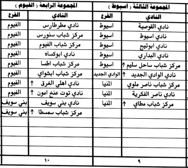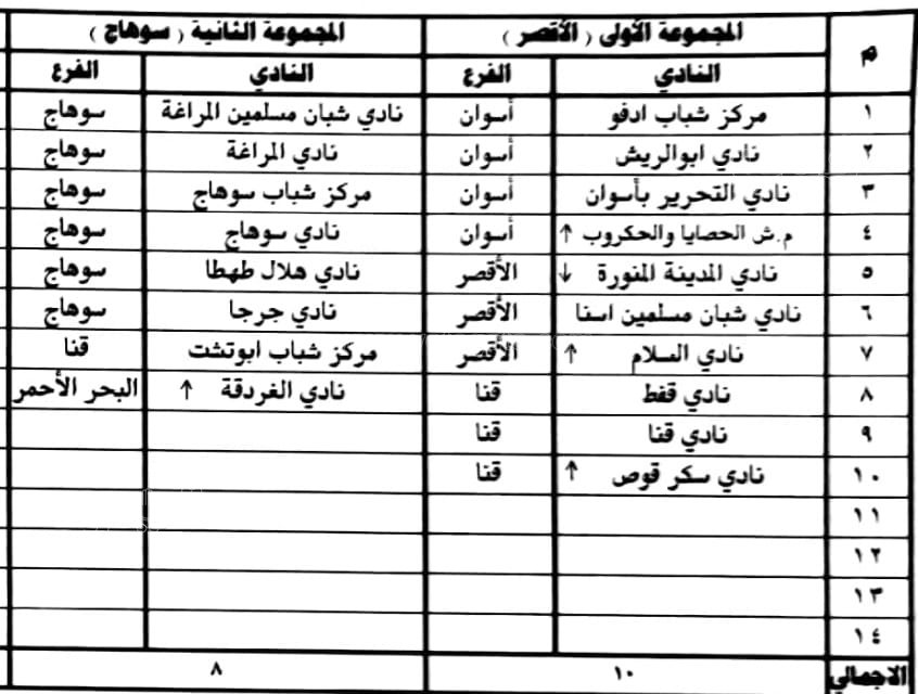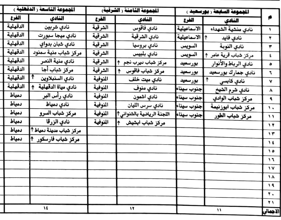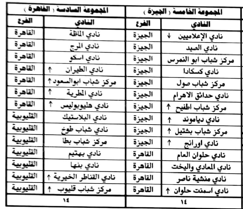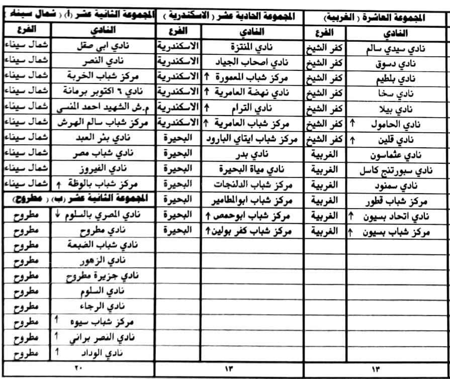 كما يهبط الفريق الأخير في الترتيب العام من المجموعات الأولي والثانية والثالثة والرابعة والسابعة والثانية عشر “أ ” والثانية عشر “ب”.