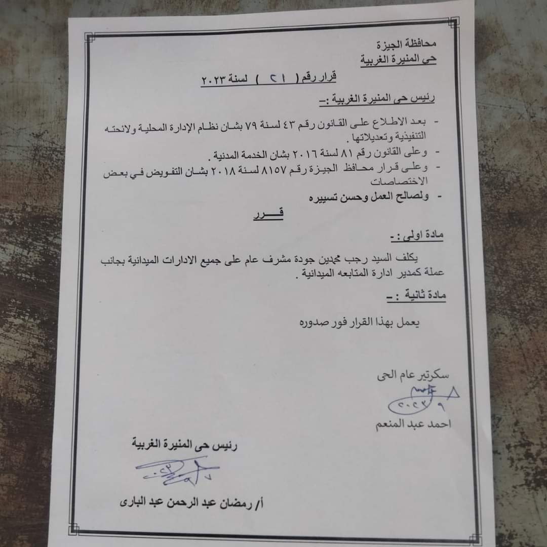 أصدر رمضان عمارة، رئيس حي المنيرة الغربية، قرارا بتعيين رجب محمدين مشرفا عاما على جميع الإدارات الميدانية بحي إمبابة إلى جانب عمله مدير إدارة المتابعة الميدانية بحي المنيرة الغربية.