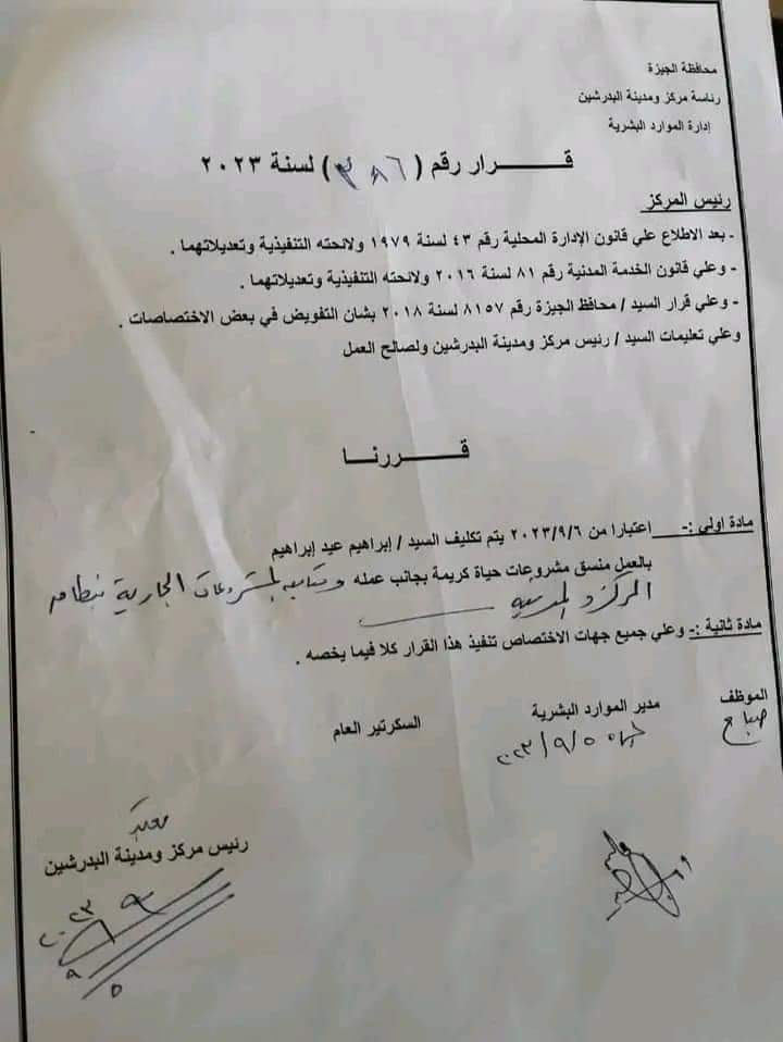 أصدر محمود شنب رئيس مركز ومدينة البدرشين قرارا بتعيين إبراهيم عيد إبراهيم منسق مشروعات حياة كريمة ومتابعة المشروعات القائمة بنطاق مركز ومدينة البدرشين بجانب عمله.