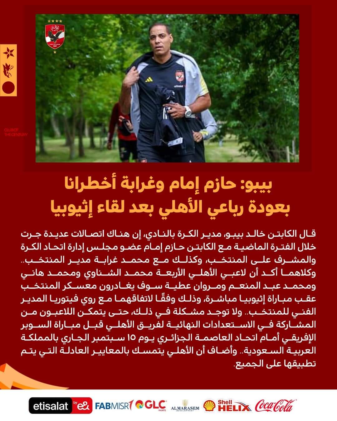 كشف خالد بيبو، مدير الكرة بالنادي الأهلي، عن إجراء اتصالات عديدة خلال الفترة الماضية مع مجلس اتحاد الكرة بالأخص حازم إمام ومحمد غرابة وكلاهما أكد أن لاعبي الأهلي الأربعة (الشناوي، محمد هاني، محمد عبد المنعم، مروان عطية) سوف يغادرون معسكر المنتخب عقب لقاء إثيوبيا، وأتى ذلك بعد اتفاق تم مع روي فيتوريا مدير فني منتخب مصر.