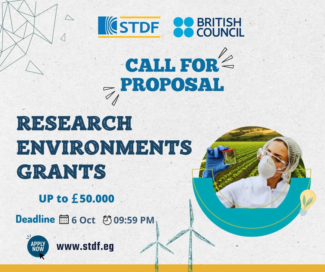 أعلنت هيئة تمويل العلوم والتكنولوجيا والابتكار (STDF) بالتعاون مع المجلس الثقافي البريطاني، عن فتح باب التقدم للنداء الأول لمنحة "دعم البيئات البحثية"، وذلك ضمن برنامج "شراكات من أجل الانطلاق للعالمية"، وسيستمر دعم المشروعات المقبولة لمدة لا تزيد عن عام، بتمويل يصل إلى 50000 جنيه إسترليني لكل مشروع.