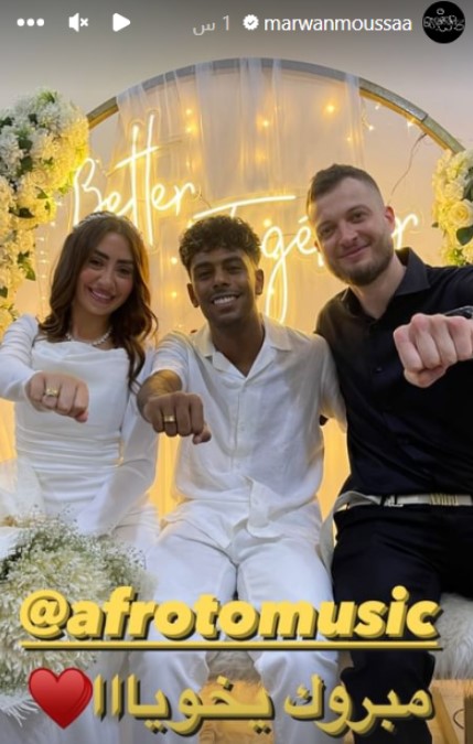 في هذا السياق، هنأ مروان موسى عفروتو بمناسبة خطبته، وذلك بنشر صورة معه من حفل الخطوبة عبر ستوري حسابه بموقع إنستجرام مع تعليق: ألف مبروك يا أخويا.