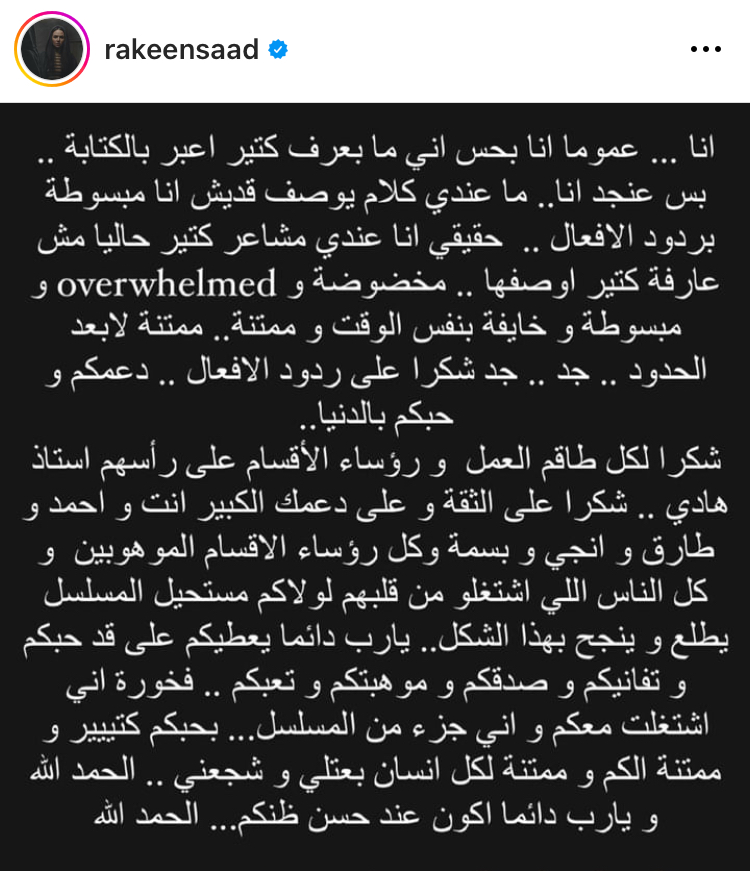 ونشرت ركين صورة تحمل رسائل شكر لأبرز من ساندها في مسلسل سفاح الجيزة، وعلقت “ بحبكم فوق الوصف”.