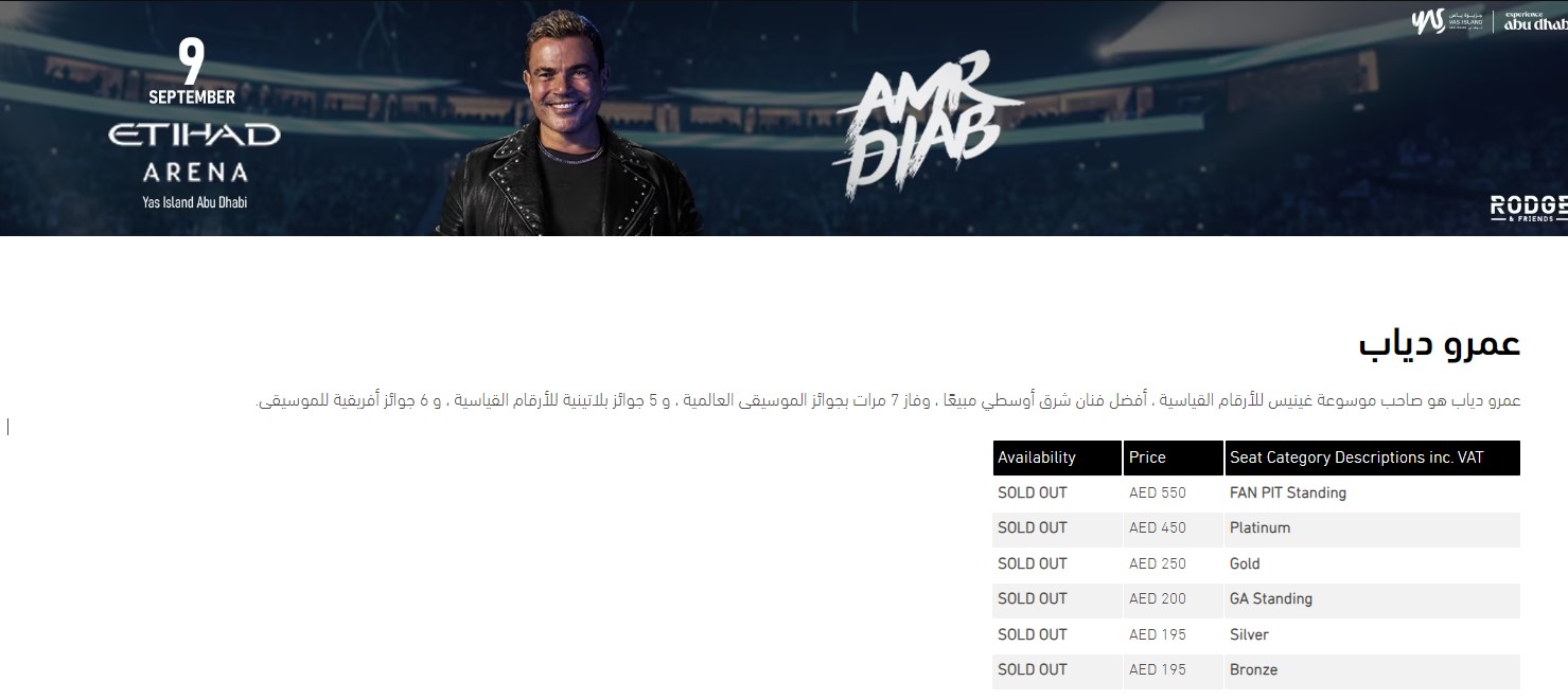 على الجانب الأخر، طرحت الشركة المنظمة لحفل عمرو دياب بأبو ظبي، أسعار وفئات تذاكر الحفل وذلك عبر موقها الرسمي، وكتبت: عمرو دياب هو صاحب موسوعة جينيس للأرقام القياسية، أفضل فنان شرق أوسطي مبيعًا، وفاز 7 مرات بجوائز الموسيقى العالمية، و5 جوائز بلاتينية للأرقام القياسية، و6 جوائز أفريقية للموسيقى.
