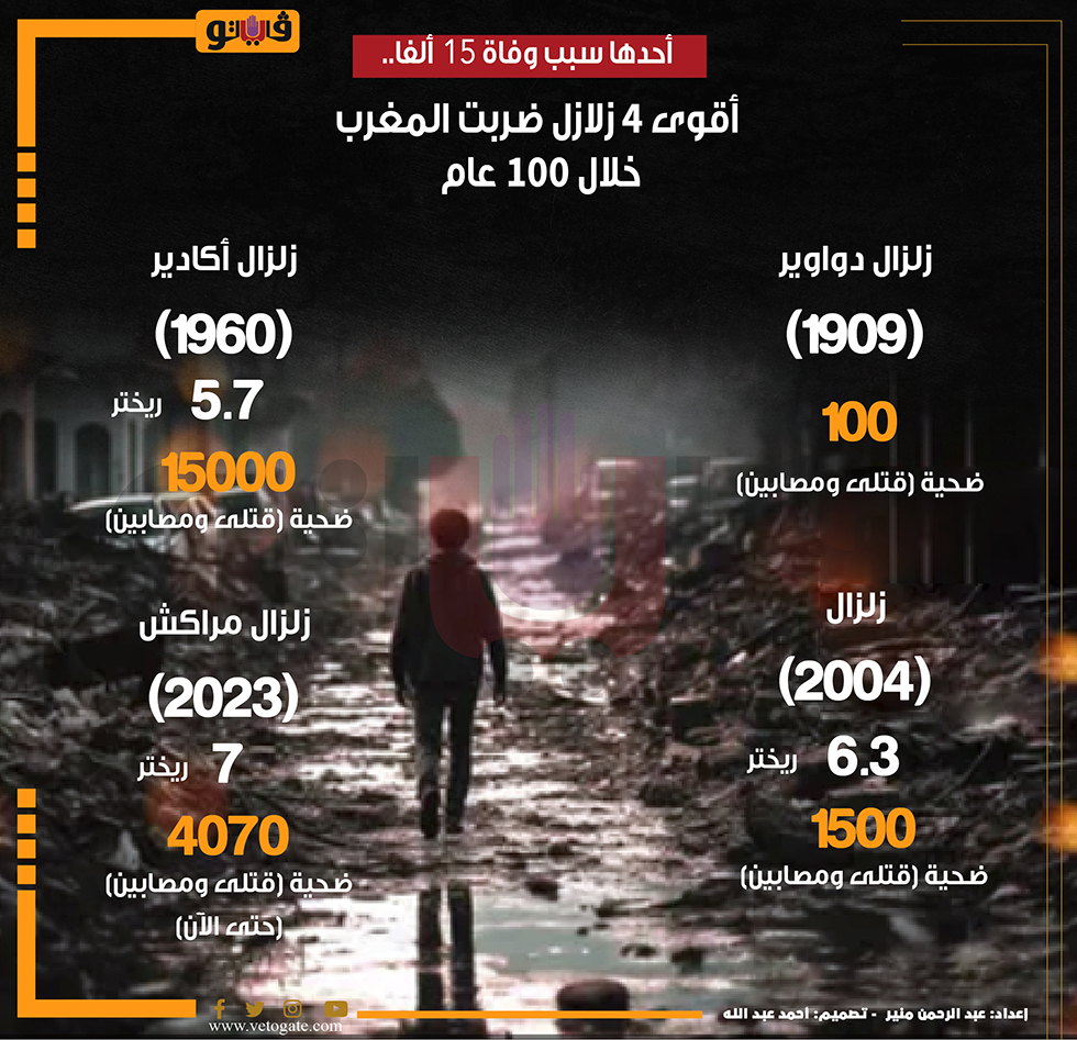 أحدها سبب وفاة 15 ألفا.. أقوى 4 زلازل ضربت المغرب خلال 100 عام (إنفوجراف) الأحد 10/سبتمبر/2023 - 01:43 م 9/10/2023 1:43:44 PM زلزال المغرب، فيتو عبدالرحمن منير شارك طباعة 18 حجم الخط شارك طباعة زلزال المغرب المغرب أقوى الزلازل التي ضربت المغرب زلزال المغرب الأن