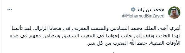 وقال الشيخ محمد بن زايد في رسالته لملك وشعب المغرب: "أعزي أخي الملك محمد السادس والشعب المغربي في ضحايا الزلزال. لقد تألمنا لهذا الحادث ونقف إلى جانب إخواننا في المغرب الشقيق ونتضامن معهم في هذه الأوقات الصعبة. حفظ الله المغرب من كل شر."