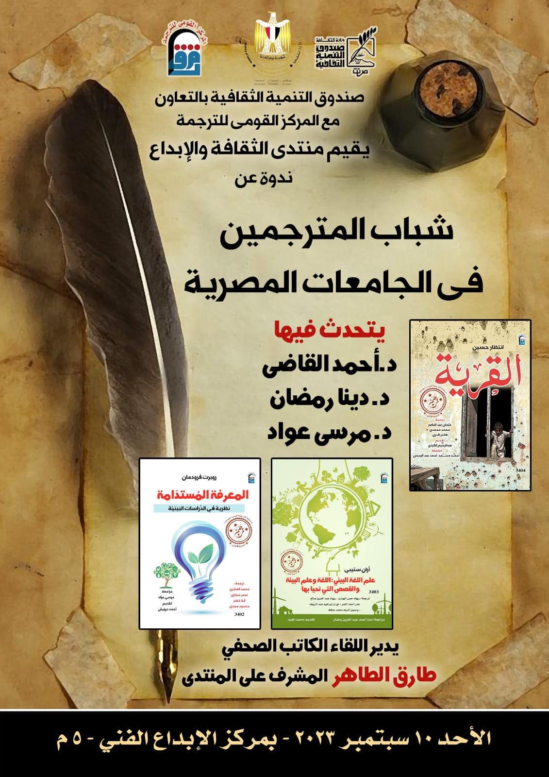 ويستضيف المنتدى الدكتور أحمد القاضى، الدكتورة دينا رمضان، والدكتور مرسى عواد، حيث يتحدثون عن تجاربهم مع شباب المترجمين التى أسفرت عن ثلاثة كتب مترجمة هى: "القرية"، "علم اللغة البيئى" و"المعرفة المستدامة" وهى نتاج تعاون بين المركز القومى للترجمة ووزارة التعليم العالى.
