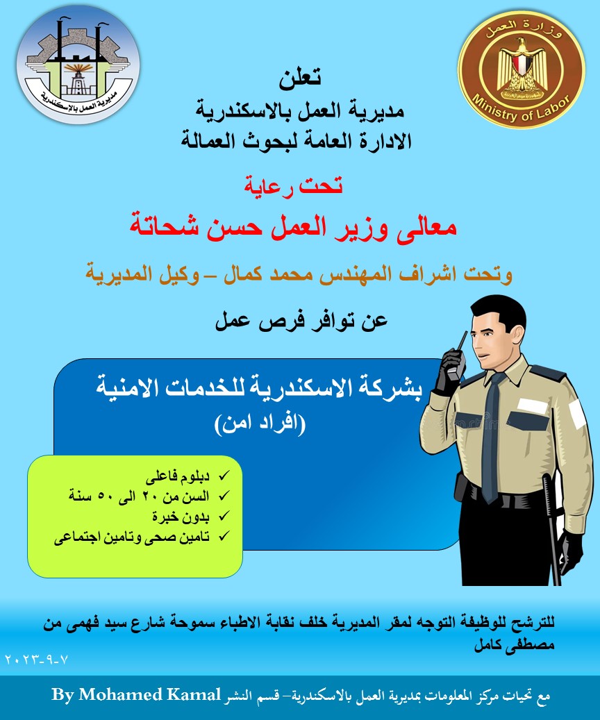 أعلنت وزارة العمل عن توفير مديرية العمل بمحافظة الإسكندرية فرص عمل للشباب من الذكور للعمل بشركة الإسكندرية على وظيفة أفراد أمن، من سن 20 إلى 50 سنة، وبدون خبرة لحملة المؤهلات المتوسطة ( الدبلوم ).