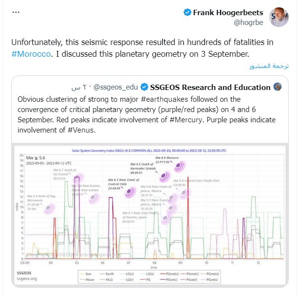 وبعد حدوث زلزال المغرب، أكد العالم الهولندي فرانك هوجربيتس على توقعه حدوث زلزال المغرب المدمر، وحدد سبب وقوع الزلزال فقال: "إنه وقع بسبب تقارب الهندسة الحرجة للكواكب، حيث يتبع الزلزال التجمع الواضح للزلازل من القوية إلى الكبرى، عند تقارب هندسة الكواكب الحرجة، وتظهر كقمم أرجوانية وحمراء في الرسم البياني، في الفترة من 4 و6 سبتمبر. تشير القمم الحمراء إلى دخول عطارد في الأمر. وتشير القمم الأرجوانية إلى دخول الزهرة."