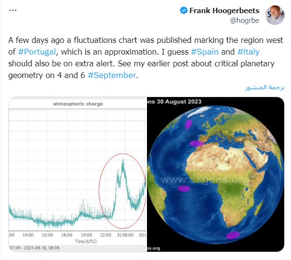 وعاد فرانك هوجربيتس، العالم الهولندي ليحذر، في نبوءته عن زلزال المغرب، حيث قال في يوم 6 سبتمبر: " وقبل أيام قليلة تم نشر مخطط التقلبات الذي يشير إلى المنطقة الواقعة غرب البرتغال وهو تقريبي. أعتقد أن أسبانيا وإيطاليا يجب أن يكونا أيضًا في حالة تأهب إضافي. راجع مشاركتي السابقة حول هندسة الكواكب الحرجة في 4 و6"