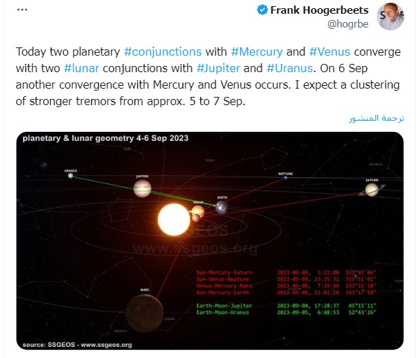 وعن نبوءات العالم الهولندي المثير للجدل فرانك هوجربيتس، فقد أطلق هوجربيتس تحذيره المعهود، تحديدًا في يوم 4 سبتمبر عندما كتب على "تويتر"منصة أكس الحالية: "اليوم يتقارب اقترانان كوكبيان مع عطارد والزهرة مع اقترانين قمريين مع المشتري وأورانوس. في 6 سبتمبر، حدث تقارب آخر مع عطارد والزهرة. أتوقع مجموعة من الهزات القوية تقريبًا. 5 إلى 7 سبتمبر"