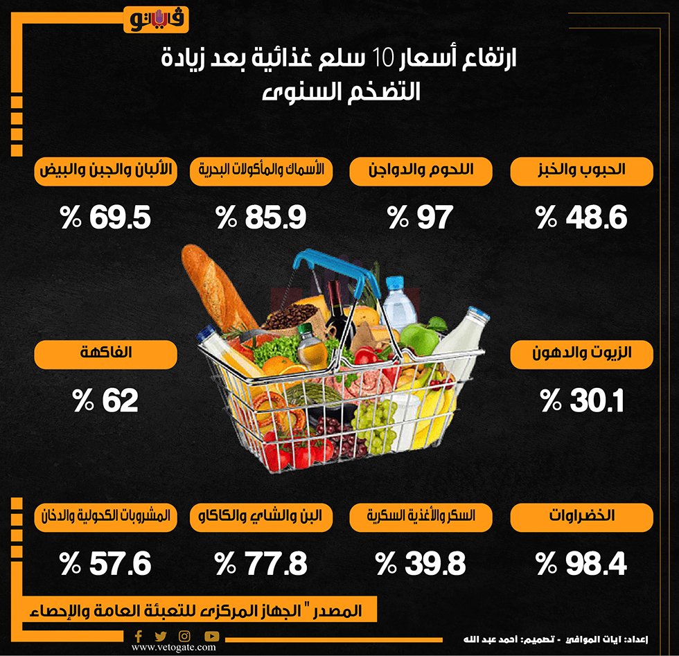 ارتفاع أسعار 10 سلع غذائية بعد زيادة التضخم السنوى (إنفوجراف) الأحد 10/سبتمبر/2023 - 12:55 م 9/10/2023 12:55:14 PM ارتفاع أسعار 10 سلع غذائية، فيتو آيات الموافى شارك طباعة 18 حجم الخط شارك طباعة اسعار الطعام والمشـروبات الجهاز المركزى للتعبئة العامة والإحصاء