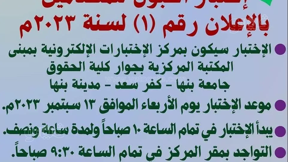 أكمل البيان أن اختبار القبول للمتقدمين بالإعلان رقم ١ لسنة ٢٠٢٣ أن الاختبار بمركز الاختبارات الإلكترونية بمبنى المكتبة المركزية بجوار كلية الحقوق جامعة بنها - كفر سعد - مدينة بنها، التواجد بمقر المركز في تمام الساعة ٩:٣٠ صباحا، إحضار بطاقة الرقم القومي وصورة منها، يتم الإعلان لاحقا عن موعد إجراء المقابلات الشخصية
