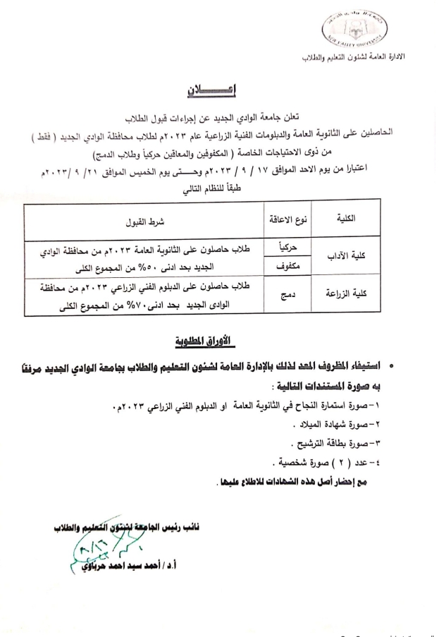 جامعة الوادي الجديد تعلن قبول طلاب جدد من ذوى الاحتياجات الخاصة