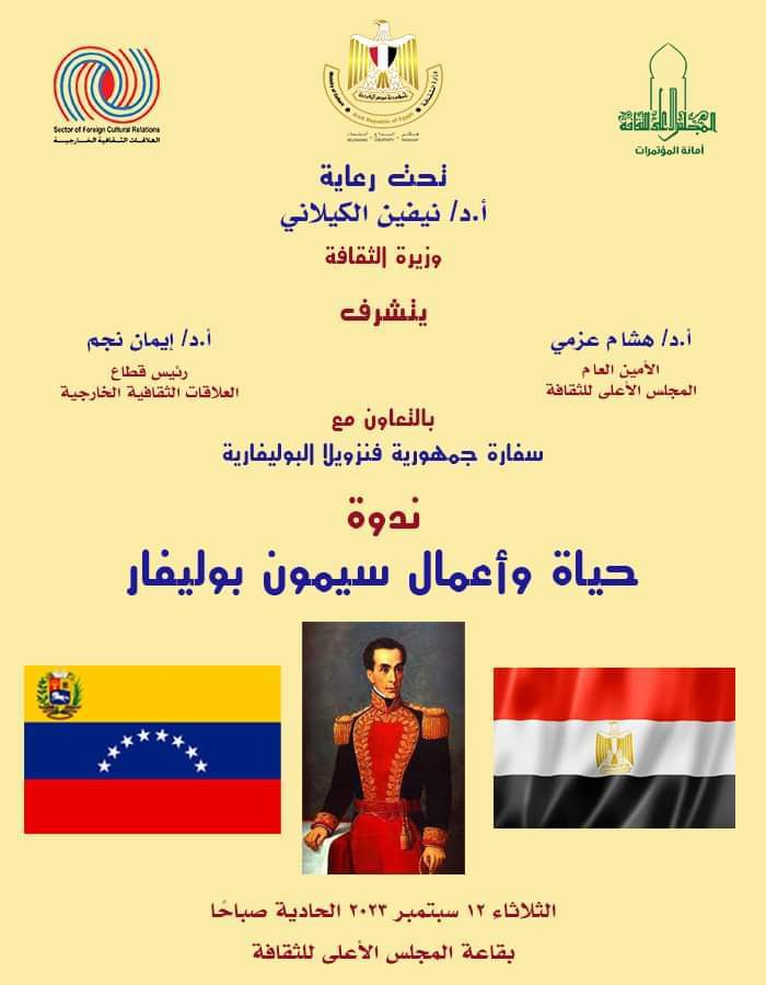 ينظم المجلس الأعلى للثقافة بأمانة الدكتور هشام عزمي، ندوة بعنوان "حياة وأعمال سيمون بوليفار"، والتى تقام بالتعاون مع قطاع العلاقات الثقافية الخارجية، وذلك في تمام الحادية عشرة من صباح الثلاثاء المقبل الموافق 12 سبتمبر الجاري، بقاعة الندوات بالمجلس الأعلى للثقافة.