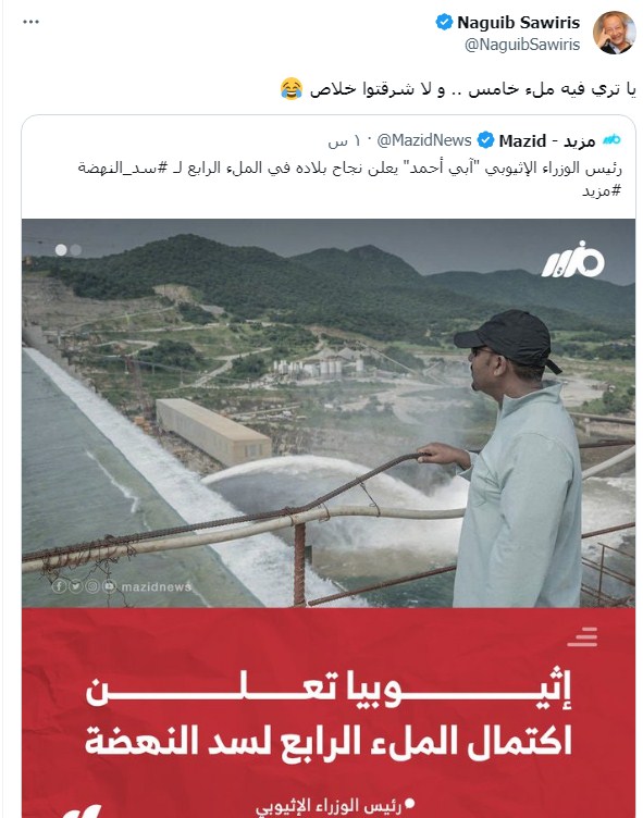 وكتب المهندس نجيب ساويرس، في رسالته التي وجهها لرئيس وزراء إثيوبيا آبي أحمد: "يا تري فيه ملء خامس.. ولا شرقتوا خلاص"، وأرفقها برمز الوجه المبتسم، للسخرية من هذا الأمر.