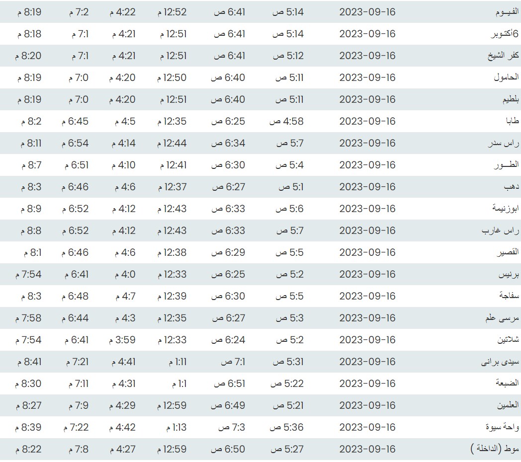 مواقيت الصلاة اليوم وفقًا للتوقيت المحلي لمدينتي القاهرة والإسكندرية وعدد من مدن ومحافظات الجمهورية من واقع بيانات الهيئة العامة للمساحة