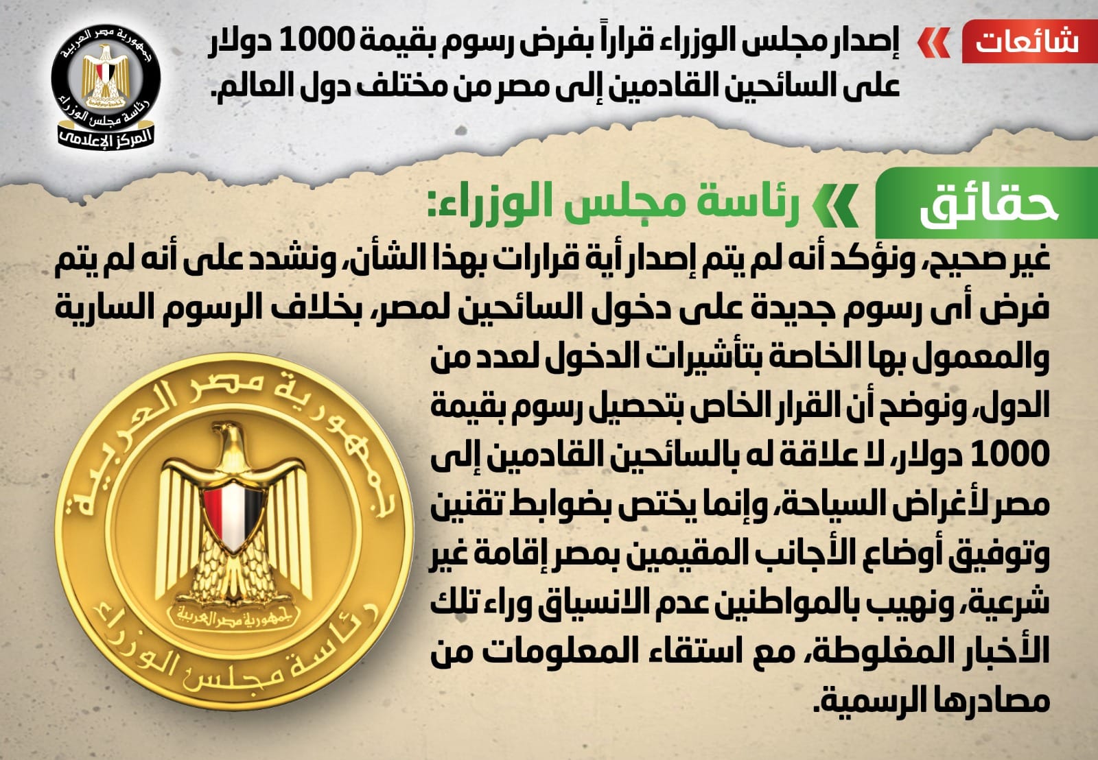 وأكد مجلس الوزراء أنه لم يتم إصدار أية قرارات بهذا الشأن، مُشددًا على أنه لم يتم فرض أي رسوم جديدة على دخول السائحين لمصر، بخلاف الرسوم السارية والمعمول بها الخاصة بتأشيرات الدخول لعدد من الدول، موضحًا أن القرار الخاص بتحصيل رسوم بقيمة 1000 دولار، لا علاقة له بالسائحين القادمين إلى مصر لأغراض السياحة، وإنما يختص بضوابط تقنين وتوفيق أوضاع الأجانب المقيمين بمصر إقامة غير شرعية، مهيبًا بالمواطنين عدم الانسياق وراء تلك الأخبار المغلوطة، مع استقاء المعلومات من مصادرها الرسمية.