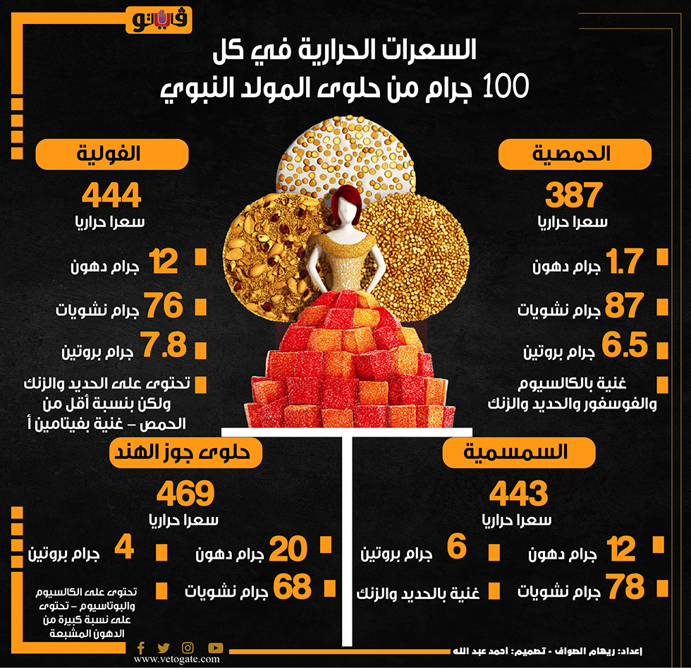 السعرات الحرارية في كل 100 جرام من حلوى المولد النبوي (إنفوجراف) الإثنين 11/سبتمبر/2023 - 04:05 م 9/11/2023 4:05:10 PM حلوى المولد النبوي ريهام الصواف شارك طباعة 18 حجم الخط شارك طباعة الدهون المشبعة الفول السوداني السعرات الحرارية لحلوى المولد النبوي أسعار حلوى المولد النبوي حلوي المولد النبوي