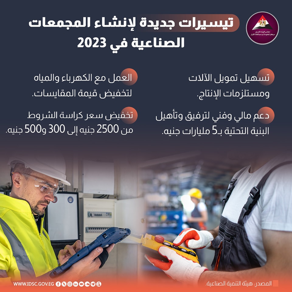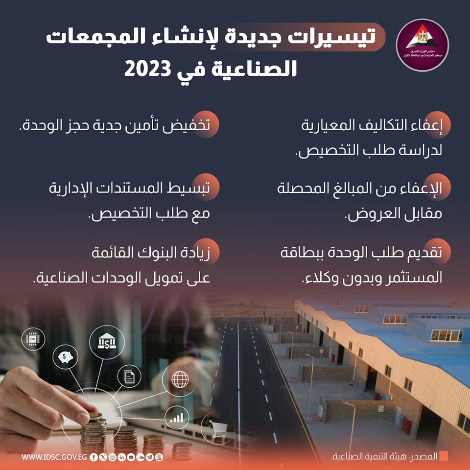 نشرت الصفحة الرسمية لمركز المعلومات ودعم اتخاذ القرار بمجلس الوزراء على موقع التواصل الاجتماعي فيسبوك انفوجراف جديد تحت عنوان (تيسيرات جديدة لإنشاء المجمعات الصناعية في 2023).