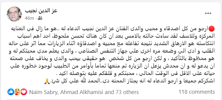 وطالبت أسرة الفنان عز الدين نجيب من كل محبيه الدعاء له بالشفاء، وكتبت: "أرجو من كل أصدقاء ومحبى والدى الفنان عز الدين نجيب الدعاء له..هو ما زال فى العناية المركزة وللأسف لقد ساءت حالته بالأمس بعد إن كان هناك تحسن ملحوظ، أحد أهم أسباب انتكاسته هو الإرهاق الشديد نتيجة تفاعله مع محبيه وأصدقاؤه أثناء الزيارات مما أثر على حالة القلب وأدى إلى وضعه مرة أخرى على جهاز التنفس الصناعى، والدى يعلم مدى محبتكم له وهو محظوظ بالتأكيد، ولكن أرجو من كل شخص هو حقيقى بيحب والدى ويخاف على صحته أن يدعو له وإن محدش يزعل أن الزيارة تم منعها تماما بأوامر من الطبيب لوجود خطورة على حياته على الأقل فى الوقت الحالى، محبتكم وقلقكم عليه بتوصله أكيد، أشكركم جميعا وأرجو الدعاء له أنه يجتاز المحنة دى..الحمد لله على كل شئ.".