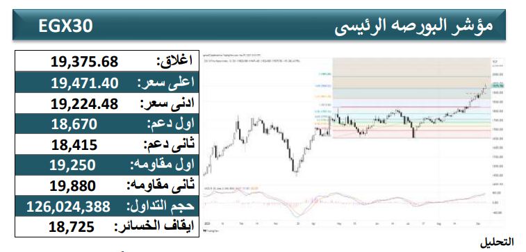 المؤشر الرئيسي EGX 30 أغلق أمس عند وتيرة إيجابية بمستوى يقارب الـ19400 نقطة، ومن المتوقع أن يستمر فى الثبات أعلى مستوى الدعم الرئيسي 19200 نقطة بزيادة عمليات الشراء قد يدفعه إلى الاستمرار في حصد المكاسب وتحقيق مستويات تاريخية جديدة والوصول السهل إلى المستوى 20000 نقطة خلال تعاملات الربع الثالث من العام الجاري، مدعومًا باستمرار نشاط الأسهم القيادية واستمرار اتجاه المؤسسات المالية نحو الشراء.