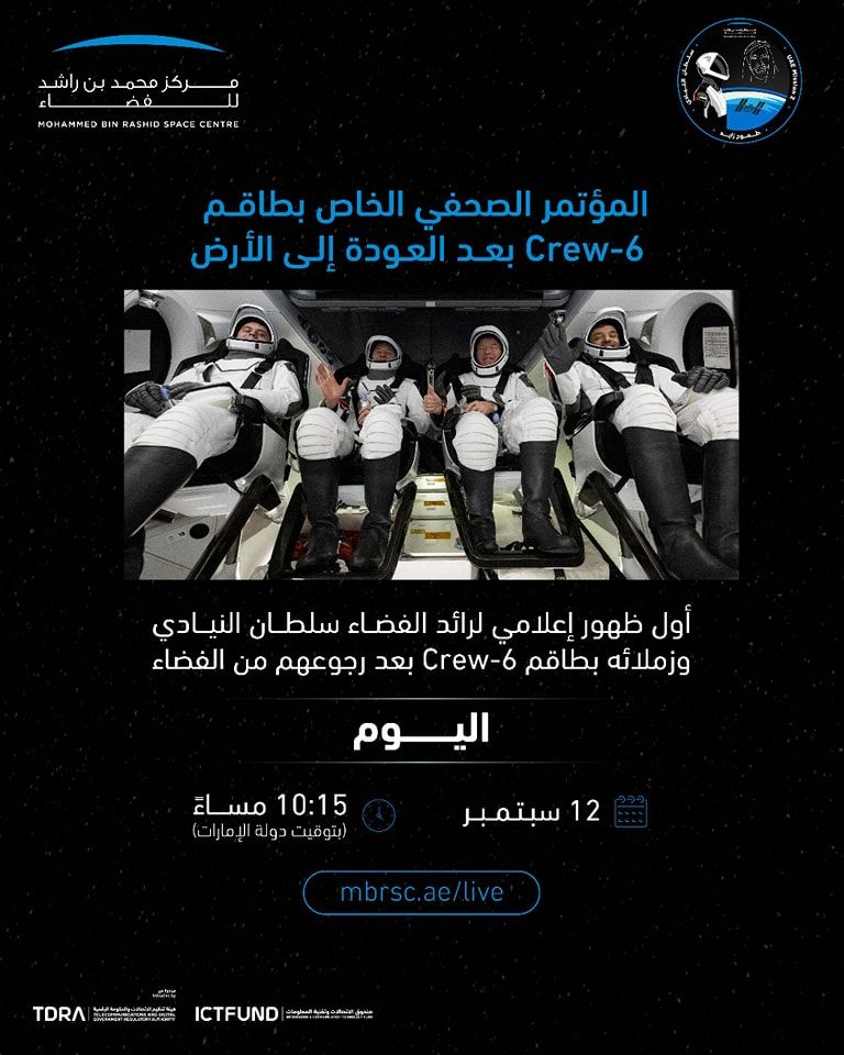 أعلن مركز محمد بن راشد للفضاء، عن مؤتمر صحفي خاص بطاقم Crew-6، مساء الثلاثاء، بعد أيام من عودتهم للأرض وانتهاء مهمة امتدت لـ6 أشهر.