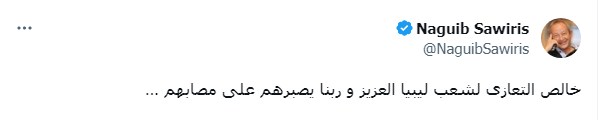 وكتب رجل الأعمال نجيب ساويرس في رسالته للشعب الليبي " خالص التعازى لشعب ليبيا العزيز وربنا يصبرهم على مصابهم …"