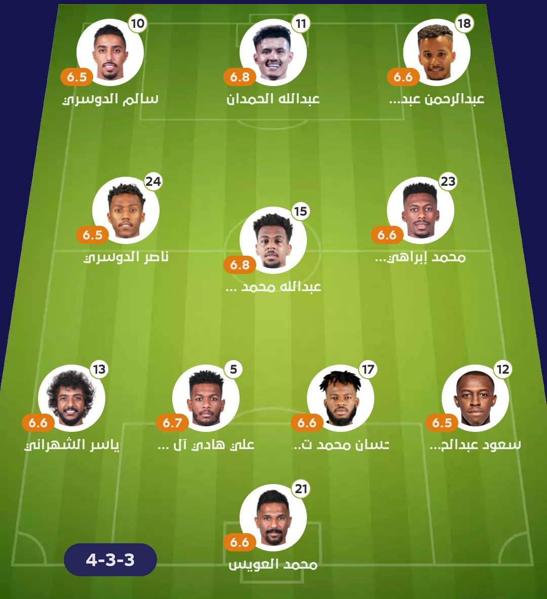 خط الدفاع: سعود عبدالحميد، حسان محمد، البليهي، الشهراني