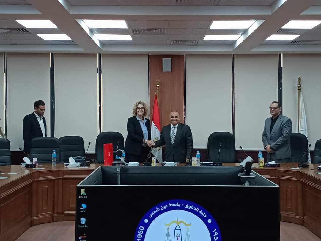 استقبل الدكتور محمد صافى، عميد كلية الحقوق بجامعة عين شمس، والأستاذ الدكتور ياسين الشاذلى، وكيل الكلية لشئون الدراسات العليا والبحوث، الدكتورة فانيسا سيريا بوتر، نائب رئيس جامعة Essex ومديرة قطاع التعاون الدولي بالجامعة، بغرض بحث سبل التعاون مع الكلية فيما يخص الشعبة الإنجليزية.