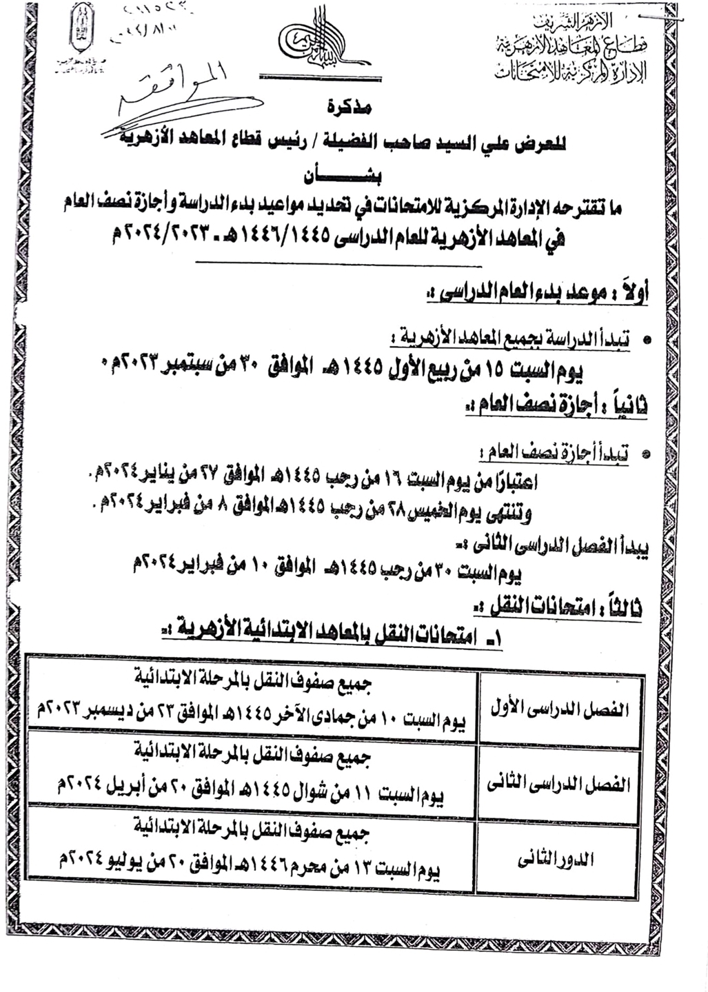 - الفصل الدراسى الأول: يوم السبت 10 من جمادى الآخر 1445هـ الموافق 23 من ديسمبر 2023 م