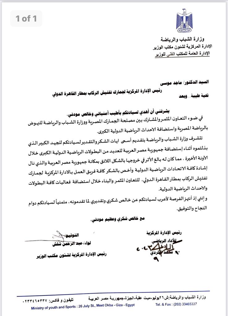 وخص خطاب الشكر والتقدير لفريق عمل الإدارة المركزية لجمارك الركاب بمطار القاهرة الدولي، للتعاون المثمر والبناء خلال استضافة فعاليات كافة البطولات والأحداث الرياضية الدولية.
