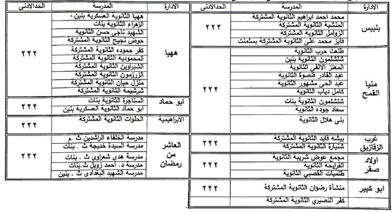 وتقرر أن يكون الحد الأدنى للقبول بالثانوي العام 222 درجة بدلًا من 225 درجة وفصول الخدمات 185 درجة بدلا من 190 درجة علي أن يسمح بقبول الطلاب الحاصلين علي 222 درجة من أي إدارة تعليمية بشرط استمرار الطلاب بنفس المدرسة طوال سنوات الدراسة بالثانوية العامة وذلك طبقا للجدول المرفق