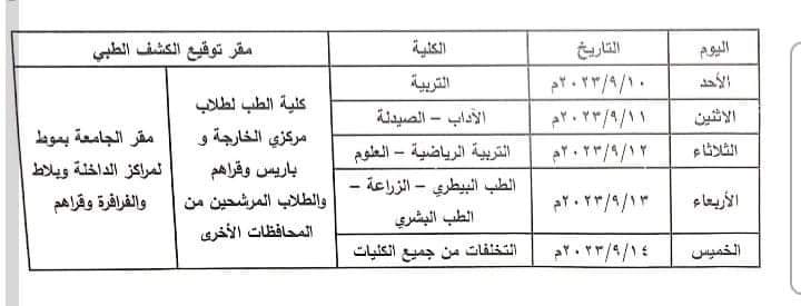 مواعيد إجراء الكشف الطبي للطلاب الجدد