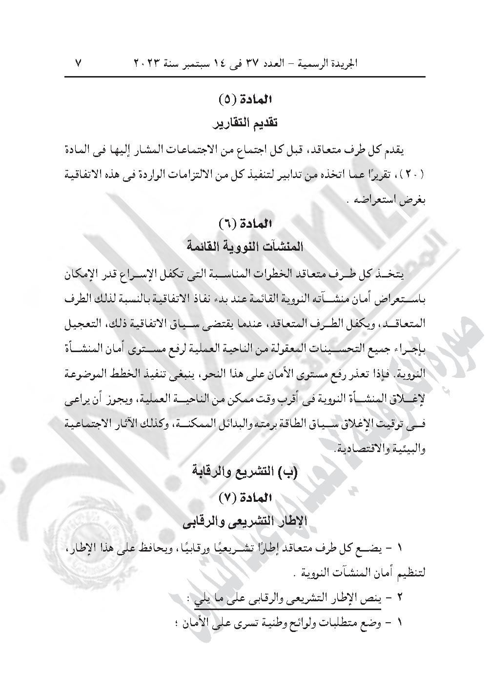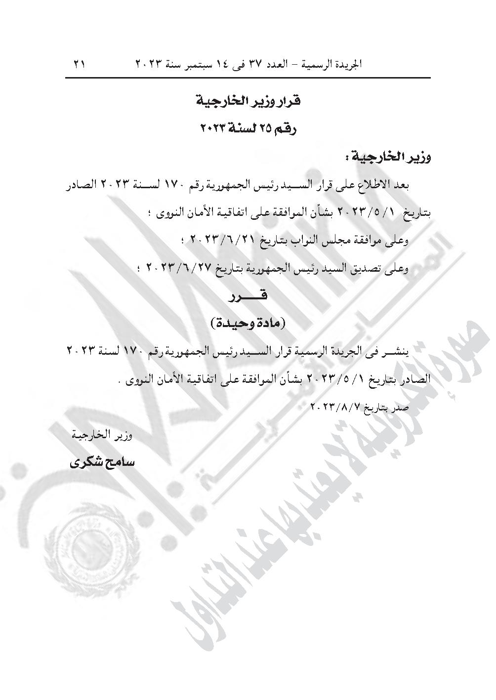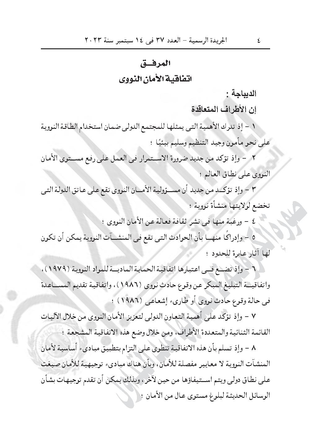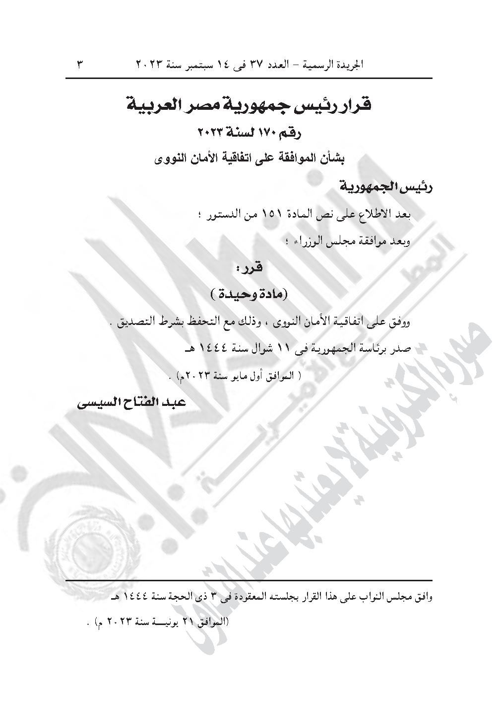 -القرار الجمهوري رقم 170 لسنة 2023، بشأن الموافقة على اتفاقية الأمان النووى. حيث وافق رئيس الجمهورية على اتفاقية الأمان النووي، وذلك مع التحفظ بشرط التصديق. وصدر برئاسة الجمهورية فى 11 شوال سنة 1444 هجرية.