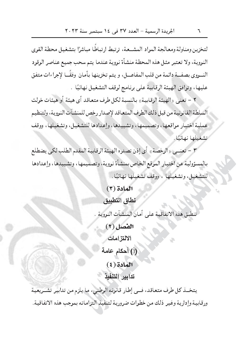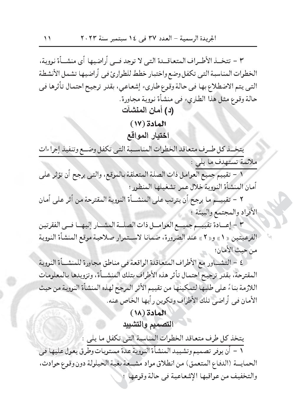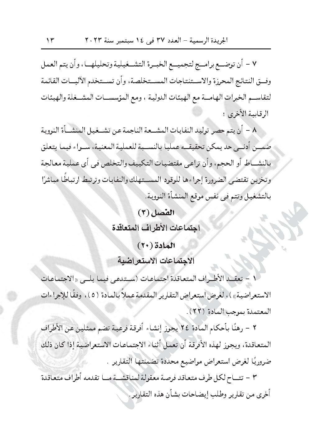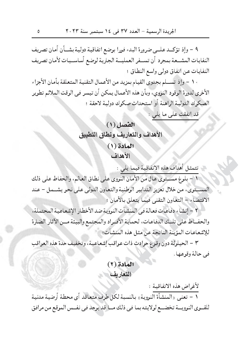 -القرار الجمهوري رقم 170 لسنة 2023، بشأن الموافقة على اتفاقية الأمان النووى. حيث وافق رئيس الجمهورية على اتفاقية الأمان النووي، وذلك مع التحفظ بشرط التصديق. وصدر برئاسة الجمهورية فى 11 شوال سنة 1444 هجرية.