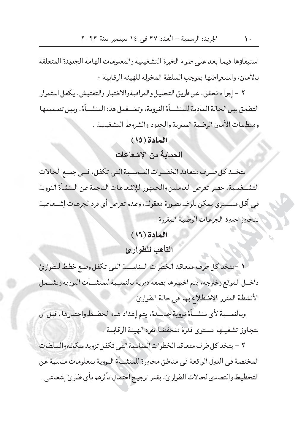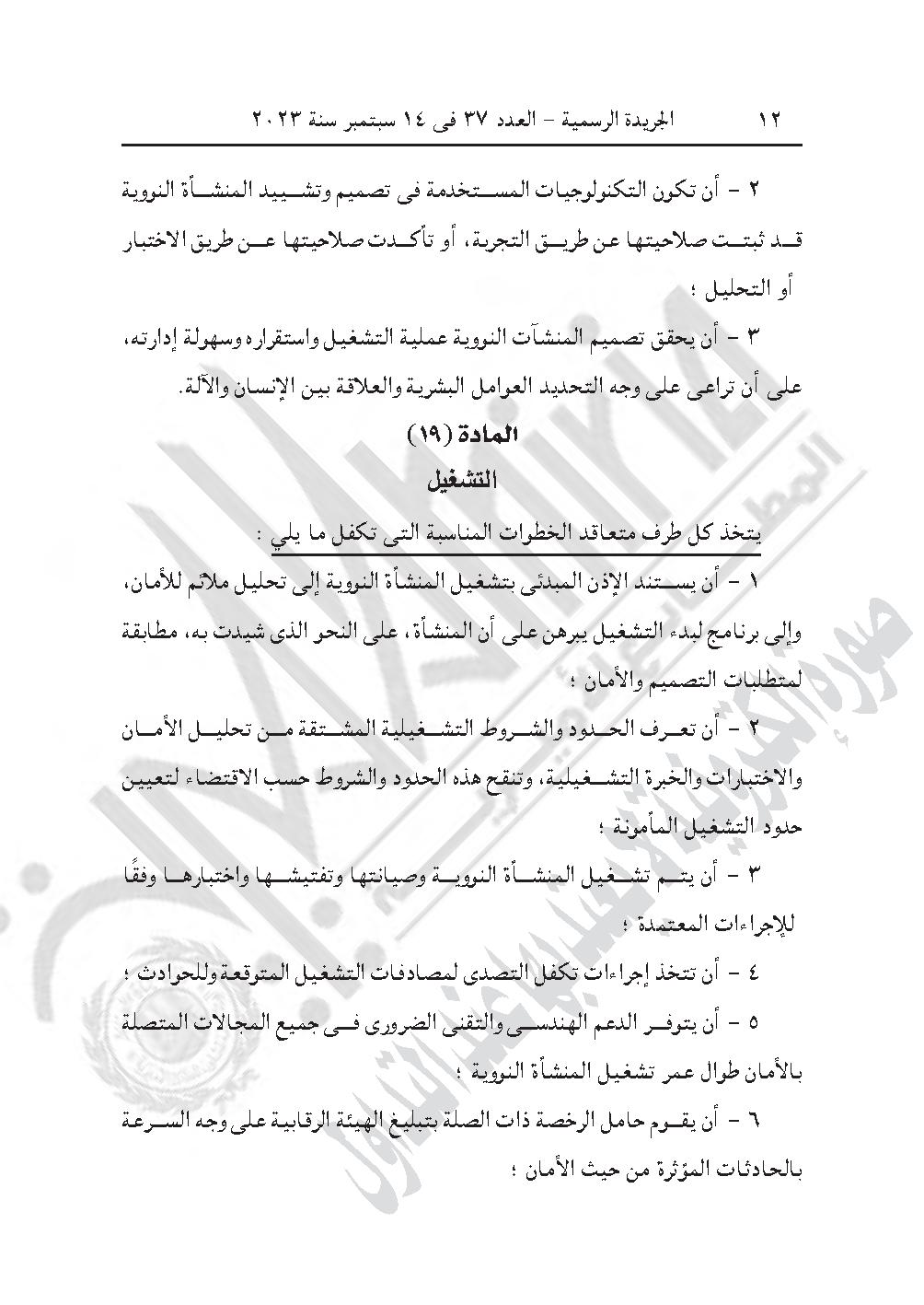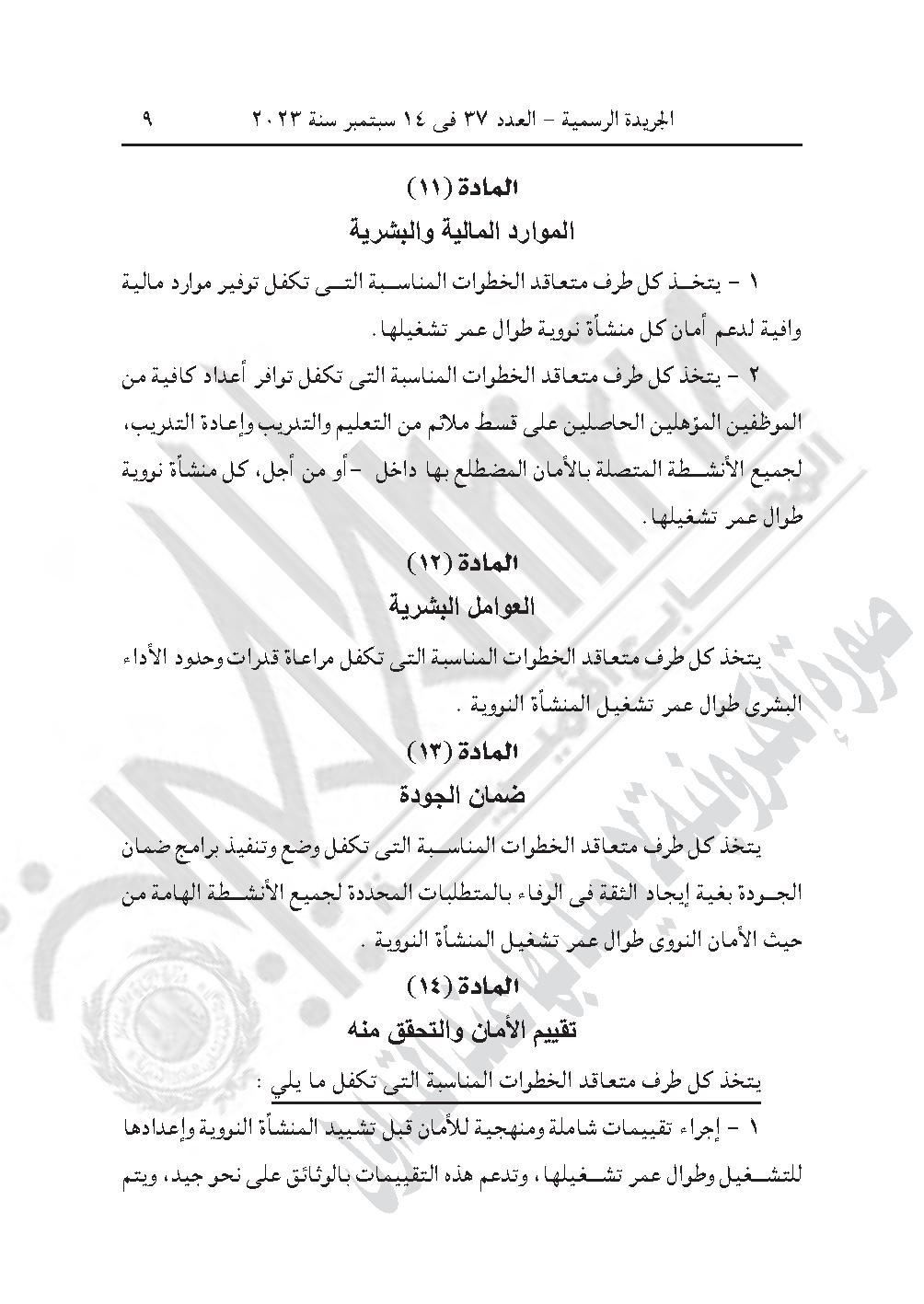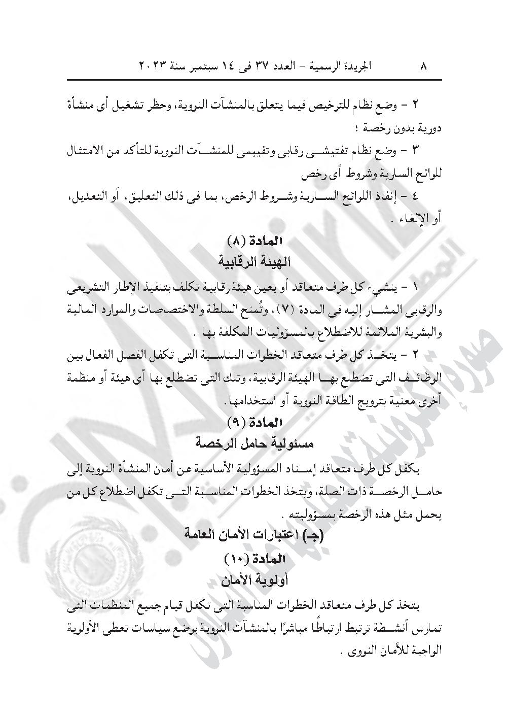 -القرار الجمهوري رقم 170 لسنة 2023، بشأن الموافقة على اتفاقية الأمان النووى. حيث وافق رئيس الجمهورية على اتفاقية الأمان النووي، وذلك مع التحفظ بشرط التصديق. وصدر برئاسة الجمهورية فى 11 شوال سنة 1444 هجرية.