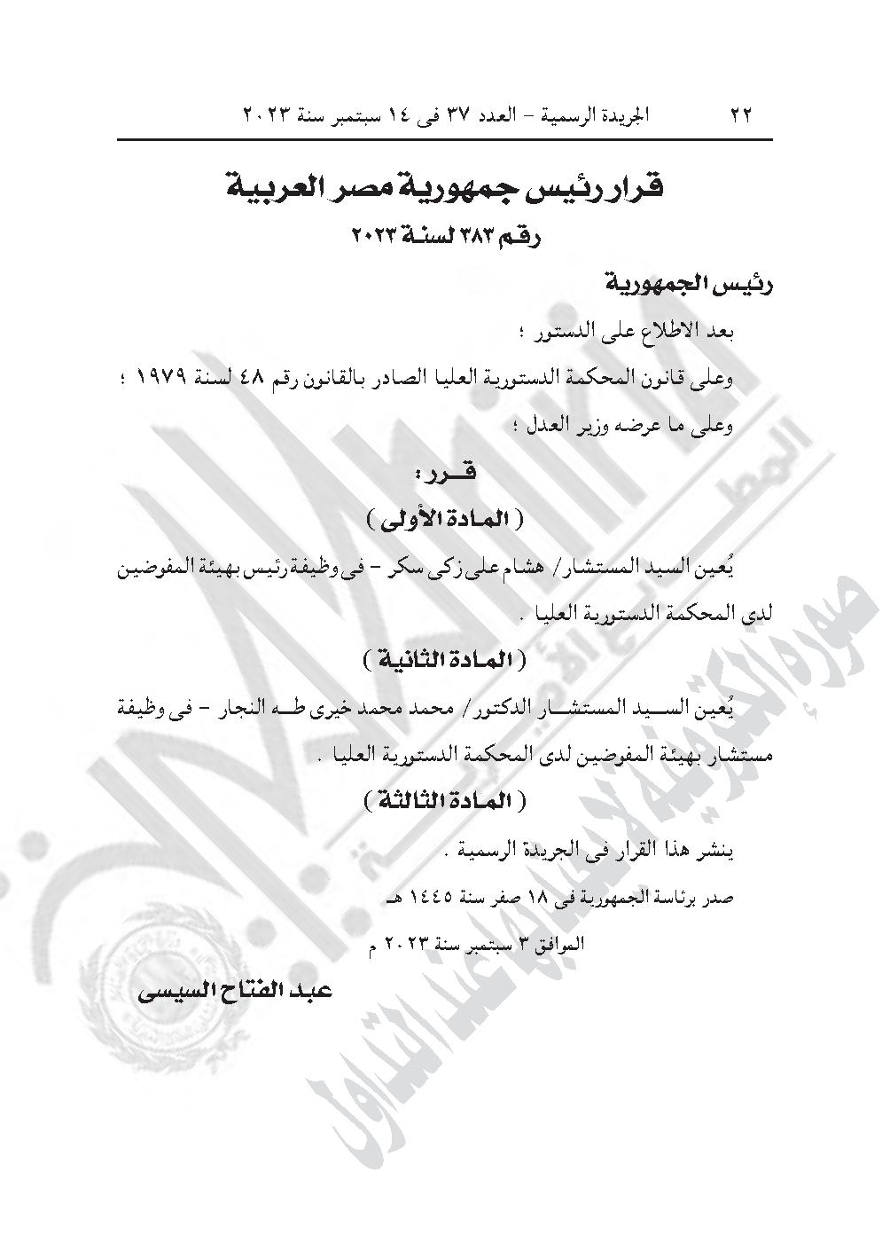 -والقرار الجمهوري رقم 383 لسنـة 2023، بشأن تعيين المستشار هشام على زكى سكر، فى وظيفة رئيس بهيئة المفوضين لدى المحكمة الدستورية العليا. وتعيين المستشار الدكتور محمد محمد خيرى طه النجار فى وظيفة مستشار بهيئة المفوضين لدى المحكمة الدستورية العليا.
