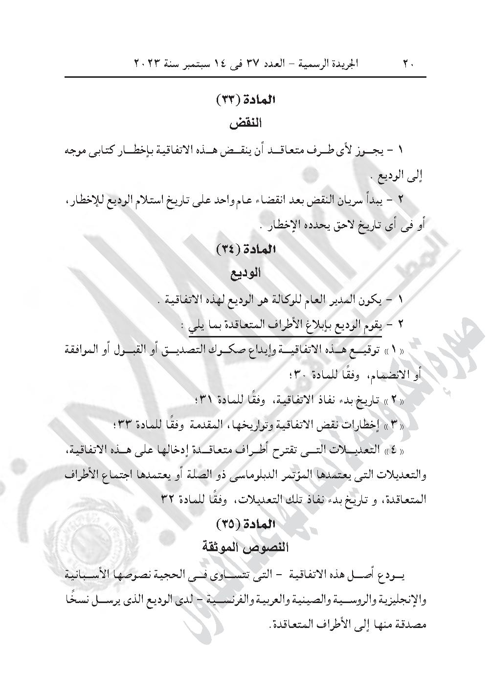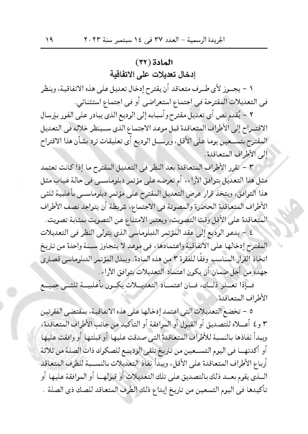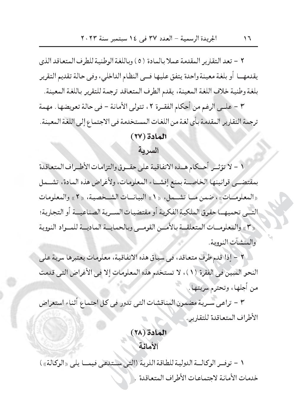 نشرت الجريدة الرسمية في عددها رقم 37، الصادر في 14 سبتمبر 2023، قرارين جمهوريين للرئيس عبد الفتاح السيسي بشأن الموافقة على اتفاقية الأمان النووي، وتعيين مستشارين بهيئة المفوضين لدى المحكمة الدستورية العليا.