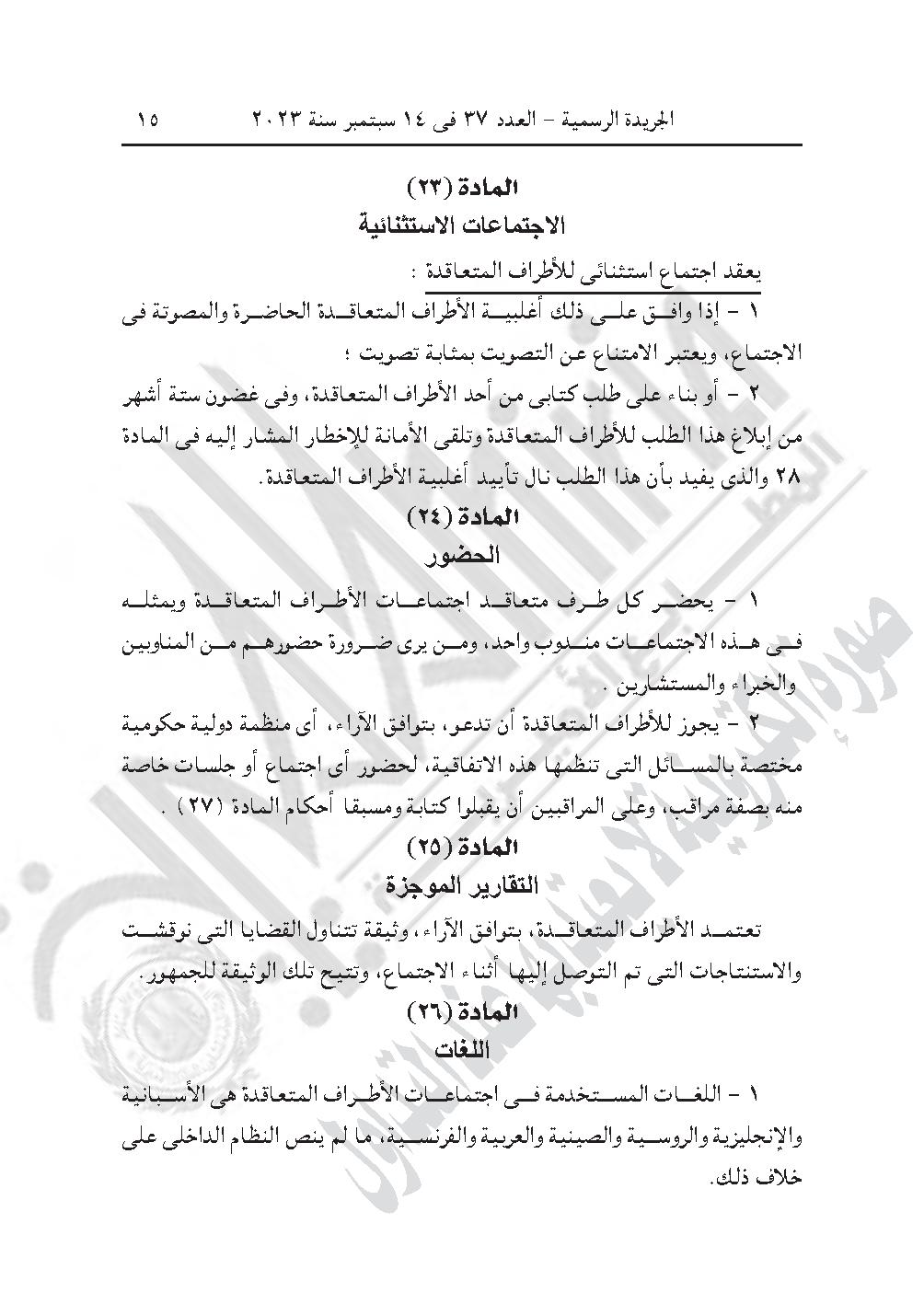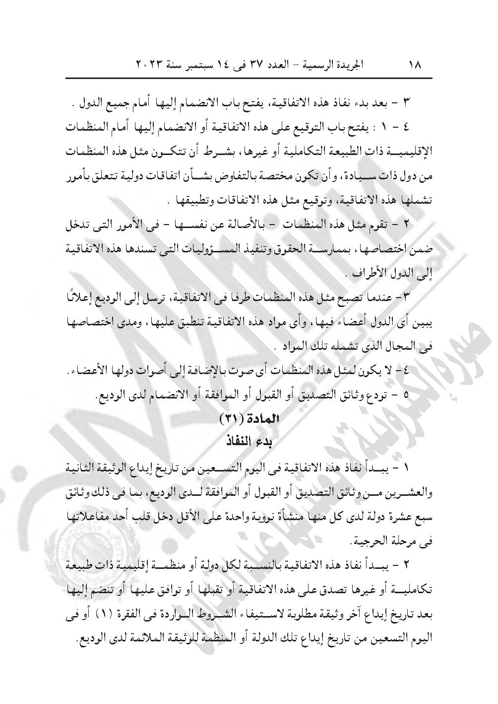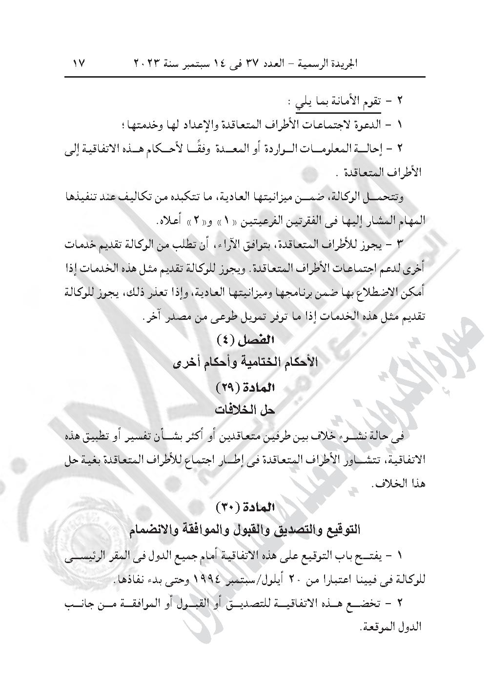 نشرت الجريدة الرسمية في عددها رقم 37، الصادر في 14 سبتمبر 2023، قرارين جمهوريين للرئيس عبد الفتاح السيسي بشأن الموافقة على اتفاقية الأمان النووي، وتعيين مستشارين بهيئة المفوضين لدى المحكمة الدستورية العليا.