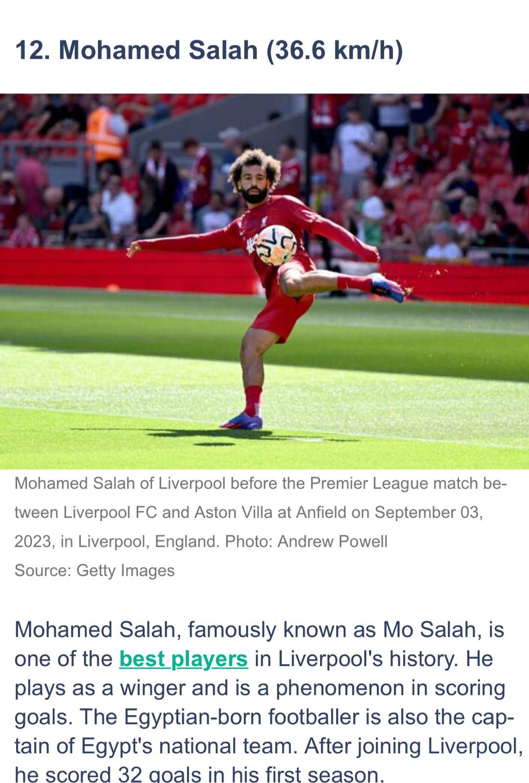ونشرت تقارير صحفية عن تواجد النجم المصري محمد صلاح في المركز الـ12 بسرعة 36.6 كم / ساعة، بينما جاء في المركز الـ20 ألفونسو ديفيز لاعب بايرن ثم هالاند مهاجم مانشستر سيتي في المركز الـ19 وأشرف حكيمي في المركز الـ36.4، وجاريث بيل في المركز الخامس بسرعة 36.9 كم / ساعة.