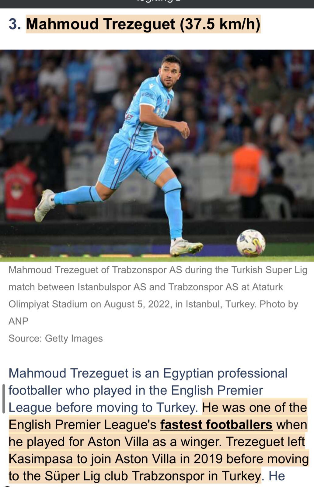 منتخب مصر، حل النجم المصري محمود حسن تريزيجيه المحترف بنادي طرابزون التركي، في المرتبة الثالثة كأسرع لاعبي العالم بسرعة 37.5 كم / ساعة، خلف كايل ووكر مدافع مانشستر سيتي وكيليان مبابي لاعب باريس سان جيرمان صاحب المركز الأول بسرعة 38 كم / ساعة.