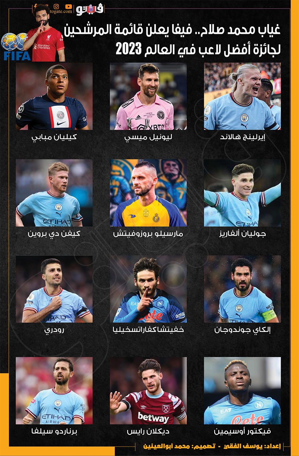 غياب محمد صلاح.. فيفا يعلن قائمة المرشحين لجائزة أفضل لاعب في العالم 2023 (إنفوجراف) الخميس 14/سبتمبر/2023 - 06:46 م 9/14/2023 6:46:56 PM المرشحون لجائزة أفضل لاعب في العالم، فيتو يوسف الفقي شارك طباعة 18 حجم الخط شارك طباعة فيفا جائزة ذا بست ذا بيست الأفضل في العالم محمد صلاح ميسي هالاند مبابي